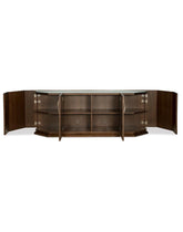 Bella DonnaVendor: Hooker FurnishingsFeatures custom designed hardware in a champagne finish, including both traditional and modern forms Four doors with soft-close hinges and magnetic catches, one adjustable wood shelf behind each of the left and right outside doors, one fixed shelf and one self-closing drawer behind pair...