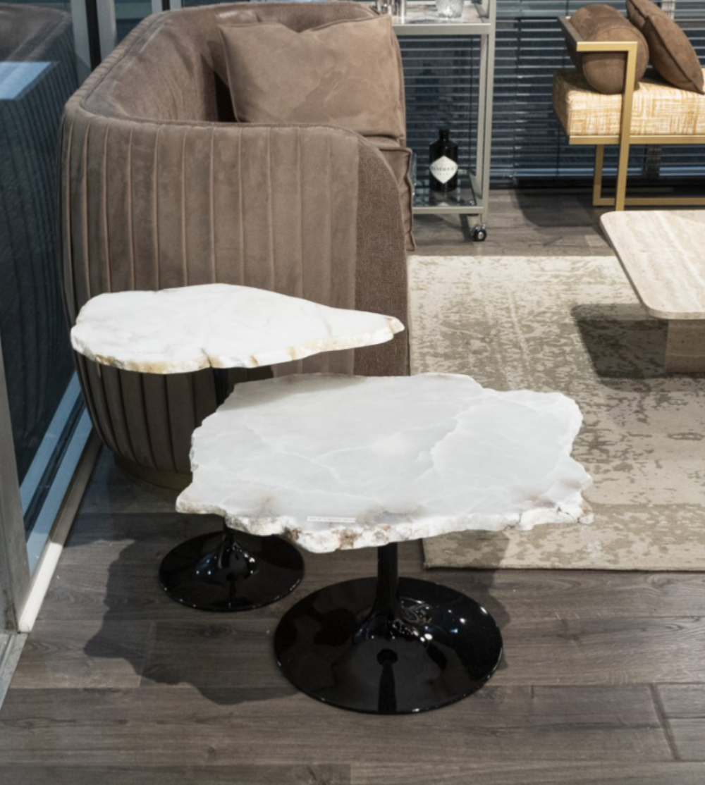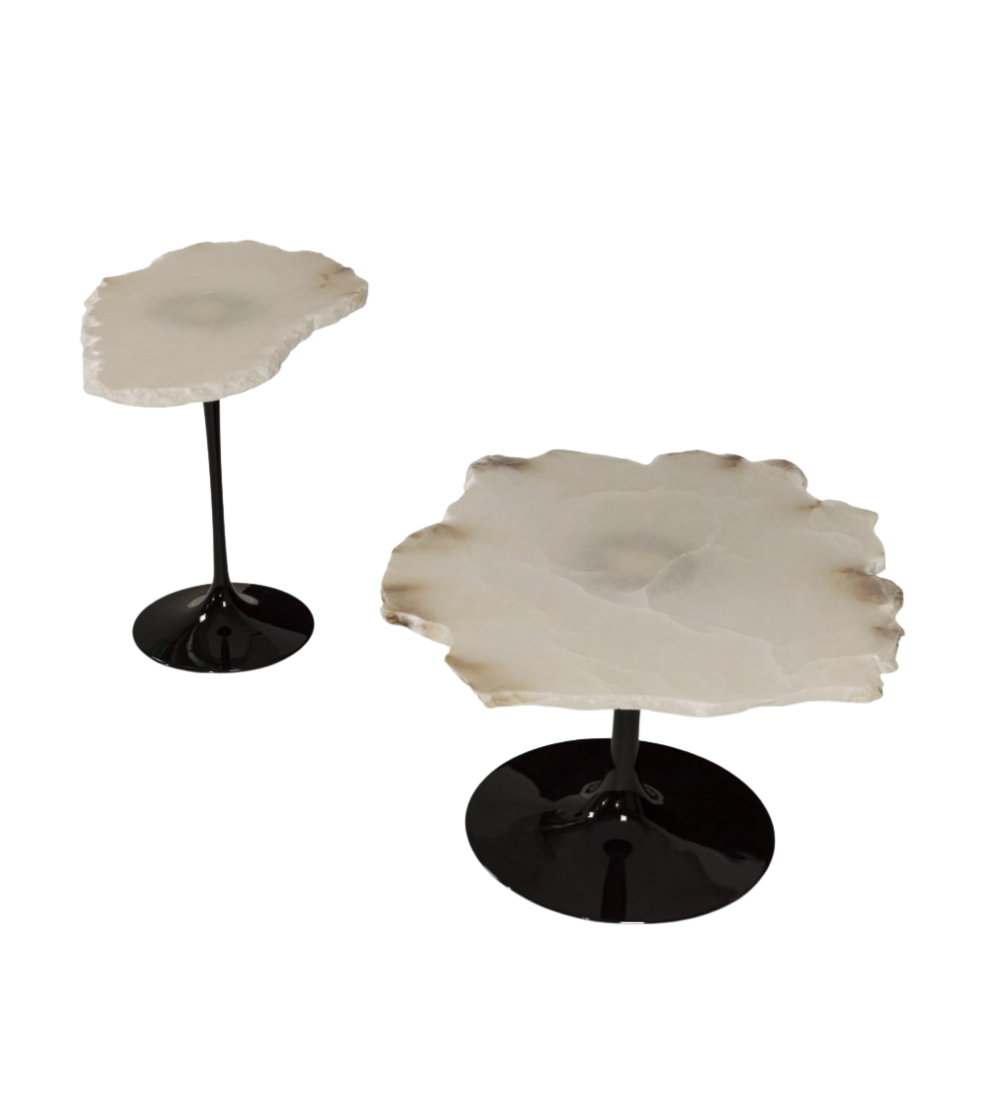 This unique set of living room tables celebrates the rare and exquisite beauty of alabaster, a stone known for its ethereal translucence and soft, glowing textures.