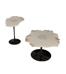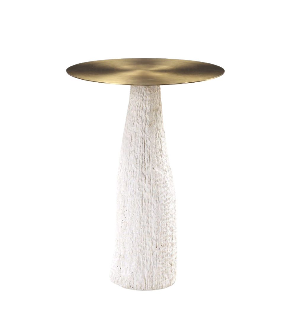 The accent table features a uniquely shaped base crafted from white cast stone, showcasing a beautiful quarried stone texture that adds depth and character.