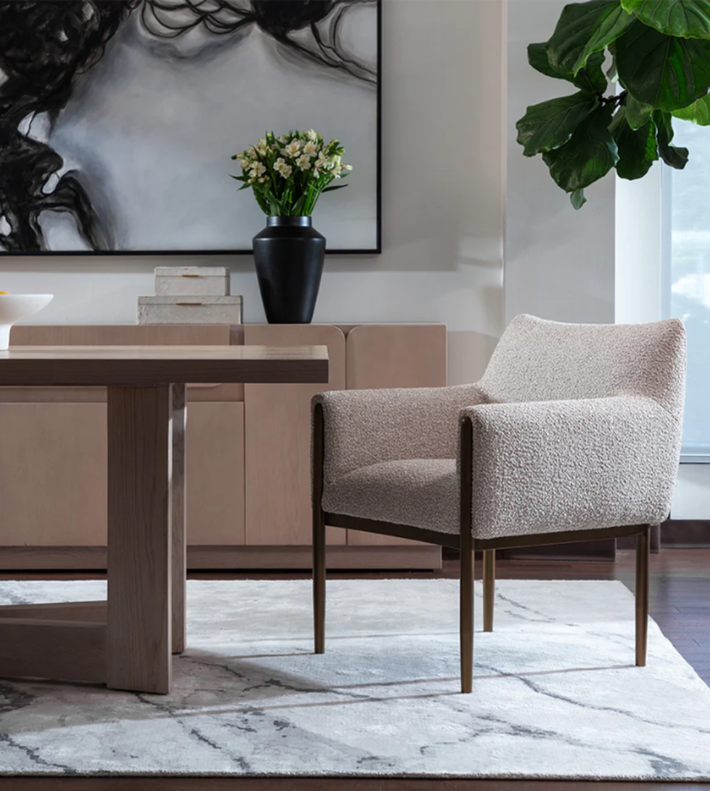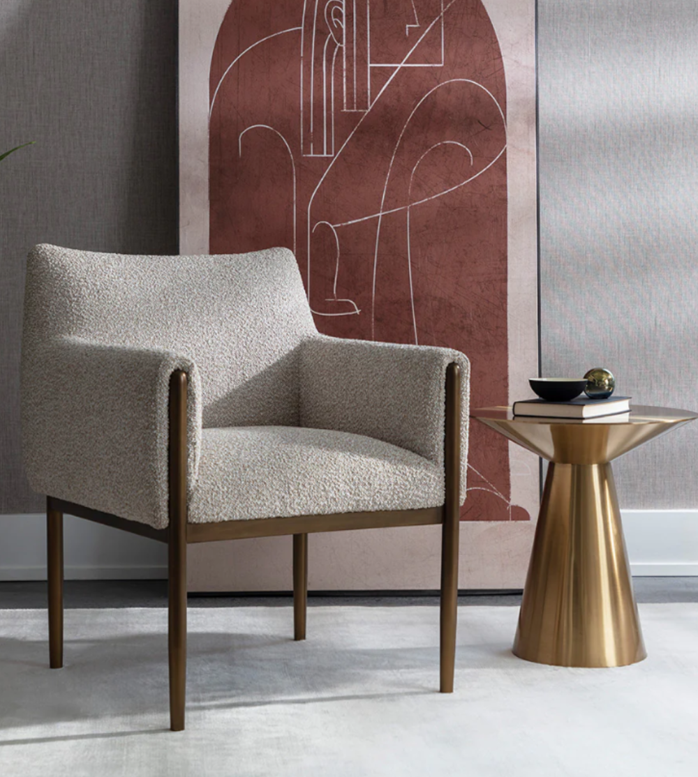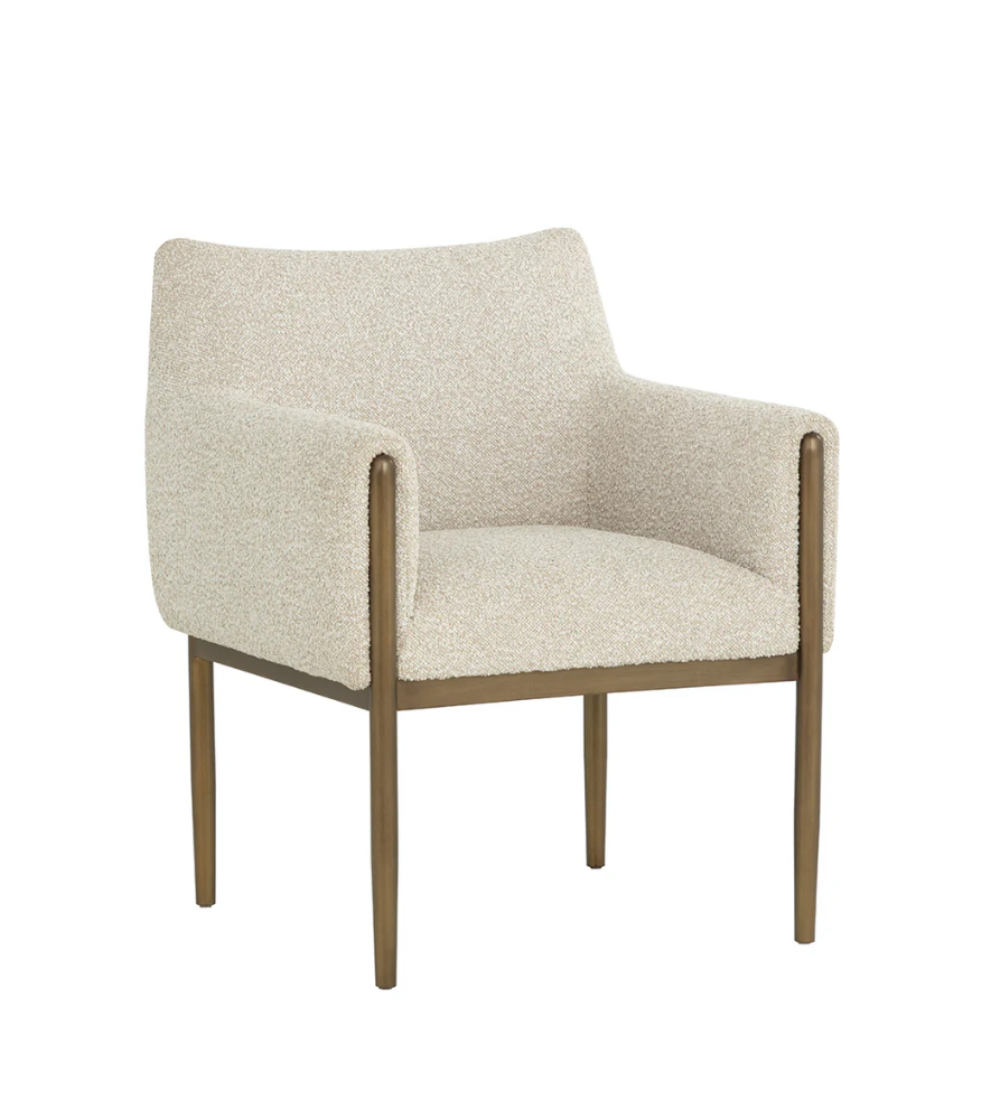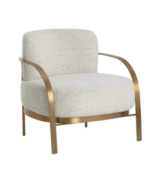 Versatile enough to accompany any space and boasting a charming silhouette with bronze powder-coated steel legs that emphasize the plush texture of Santa Cruz oatmeal fabric.