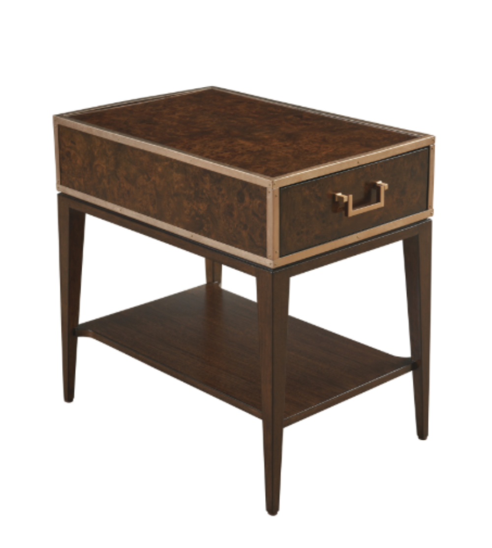 The drawer box features random walnut burl veneer on the top and sides, a soft-closing drawer, and decorative metal trim around the edges finished in rose gold over silver leaf.