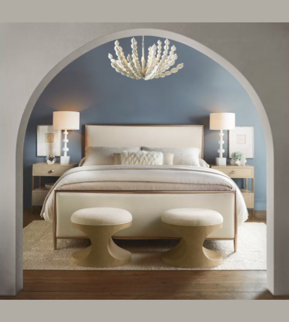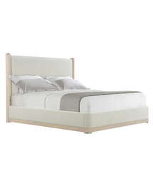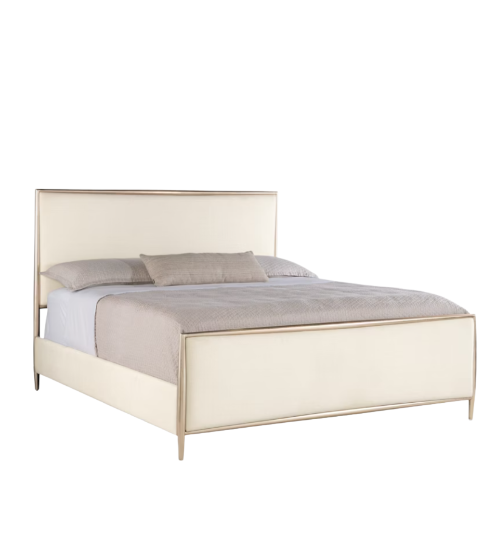 With a plated Radiance finish on its metal frame and performance fabric upholstery in Trendy Snow, this bed offers a luxurious yet minimalist aesthetic.